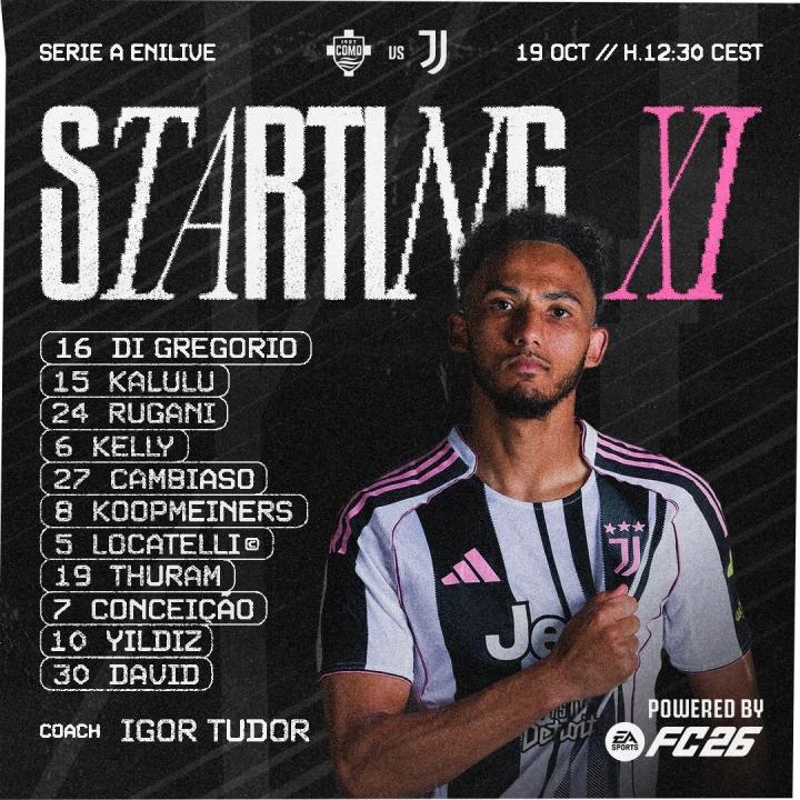 尤文图斯首发:16-迪格雷戈里奥、15-卡卢卢、24-鲁加尼、6-劳埃德-凯利、27-安德烈亚-坎比亚索、8-库普梅纳斯、5-洛卡特利、19-凯夫伦-图拉姆、7-弗朗西斯科-孔塞桑、10-凯南-伊尔迪兹、30-乔纳森-戴维
