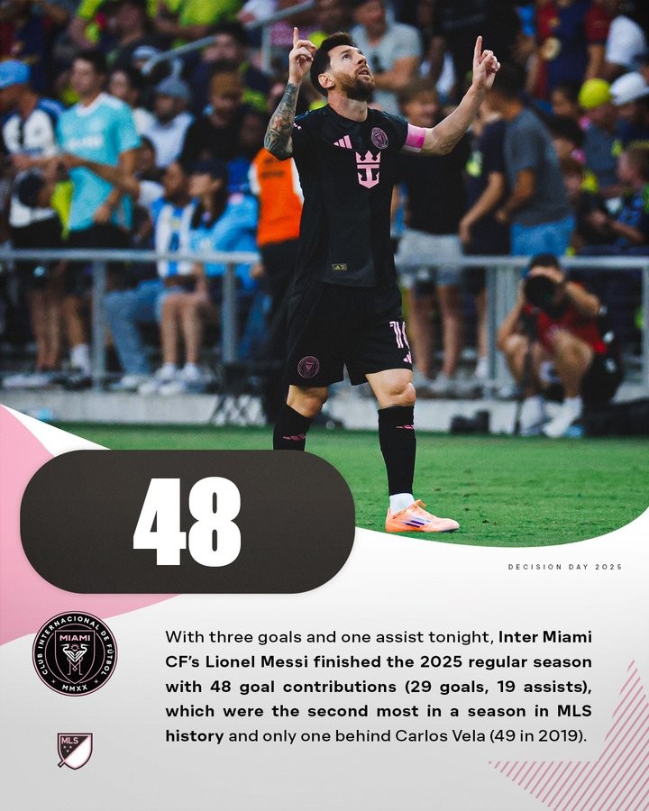 至此,梅西以29球19助的数据结束2025年美职联常规赛,共直接参与48个进球,创下美职联历史第二高纪录,仅次于卡洛斯-贝拉2019年创造的直接参与49粒进球纪录。