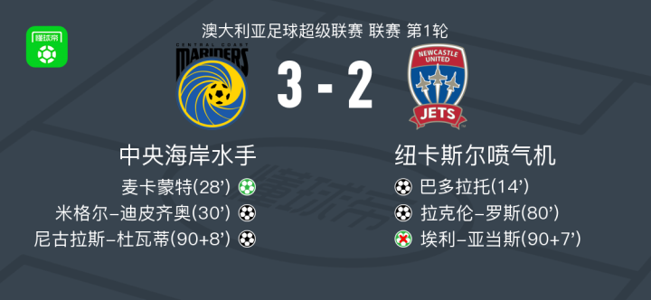 北京时间10月19日,澳大利亚足球超级联赛首轮展开较量,中央海岸水手坐镇主场迎战纽卡斯尔喷气机。比赛开局后,纽卡斯尔喷气机率先打破僵局,巴多拉托攻入一球,帮助球队取得领先。随后中央海岸水手迅速作出回应,麦卡蒙特通过点球为球队扳平比分。不久之后,米格尔-迪皮齐奥破门得分,助主队实现反超。进入下半场,埃利-亚当斯送出助攻,拉克伦-罗斯建功,将比分再度拉近。比赛进入补时阶段,埃利-亚当斯错失点球机会,未能把握扳平良机。就在补时最后时刻,尼古拉斯-杜瓦蒂攻入关键一球,为中央海岸水手锁定胜局。最终全场比赛结束,中央海岸水手以3比2战胜纽卡斯尔喷气机,收获新赛季开门红。