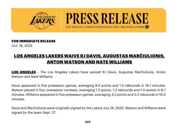 湖人官方表示:球队裁掉RJ-戴维斯、奥古斯塔斯-马修利奥尼斯、安东-沃特森和内特-威廉姆斯(杰纳森-威廉姆斯)。