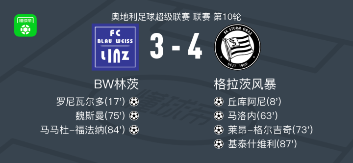北京时间10月19日奥地利足球超级联赛 联赛 第10轮,BW林茨主场对阵格拉茨风暴。BW林茨罗尼瓦尔多破门,魏斯曼破门,马马杜-福法纳破门。格拉茨风暴丘库阿尼破门,马洛内破门,莱昂-格尔吉奇破门,基泰什维利破门。最终比分BW林茨 3-4 格拉茨风暴。