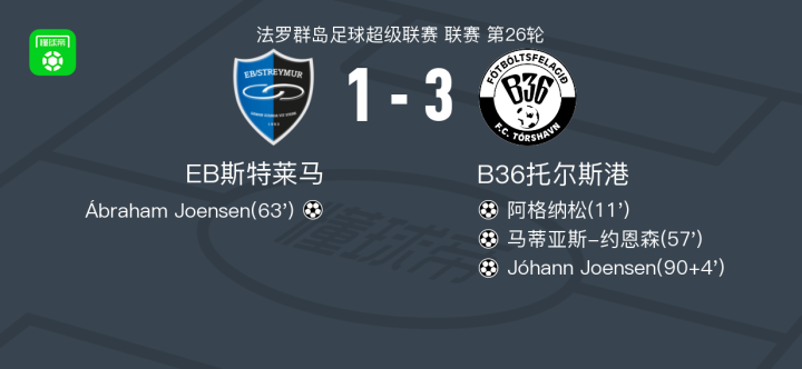 B36托尔斯港3-1EB斯特莱马,Jóhann Joensen破门,马蒂亚斯-约恩森建功