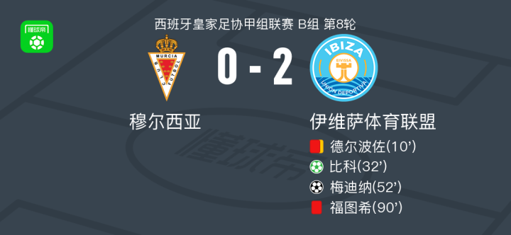 伊维萨体育联盟2-0穆尔西亚,比科破门,梅迪纳锦上添花