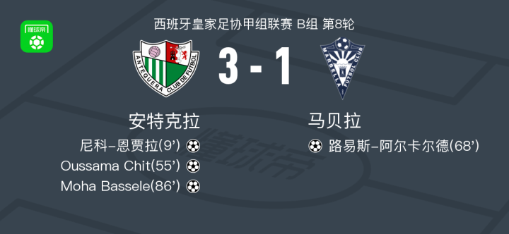 北京时间10月20日,西班牙皇家足协甲组联赛B组第8轮,安特克拉坐镇主场迎战马贝拉。比赛中,安特克拉率先打破僵局,尼科-恩贾拉接队友配合后完成破门,为主队取得领先。此后,安特克拉持续施压,Oussama Chit抓住机会再下一城,进一步扩大比分优势。易边再战,马贝拉展开反击,路易斯-阿尔卡尔德在进攻中把握住机会扳回一球,一度燃起追分希望。然而安特克拉稳住节奏,在比赛末段由Moha Bassele冷静推射得手,锁定胜局。最终,安特克拉以3比1战胜马贝拉,全取三分。