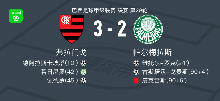 北京时间10月20日巴西足球甲级联赛 联赛 第29轮,弗拉门戈主场对阵帕尔梅拉斯。弗拉门戈德阿拉斯卡埃塔破门,佩德罗破门,若日尼奥破门。帕尔梅拉斯维托尔-罗克破门,古斯塔沃-戈麦斯破门。最终比分弗拉门戈 3-2 帕尔梅拉斯。