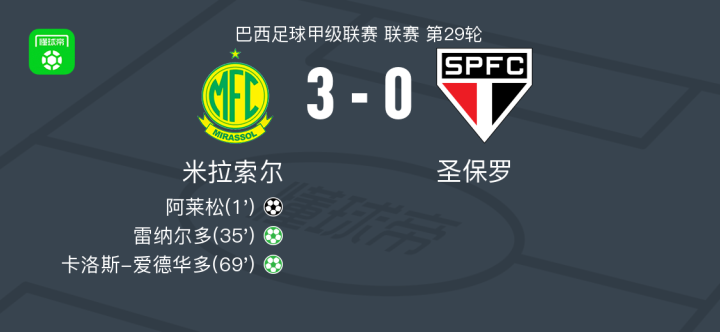 米拉索尔3-0大胜圣保罗,卡洛斯-爱德华多点射破门,雷纳尔多传射