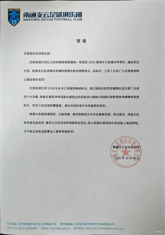 欣闻贵俱乐部以出色的赛场表现提前一轮锁定2025赛季中乙联赛冲甲席位,值此欢庆时刻,南通支云足球俱乐部谨向贵俱乐部全体教练员、运动员、工作人员及广大无锡球迷致以最诚挚的祝贺!