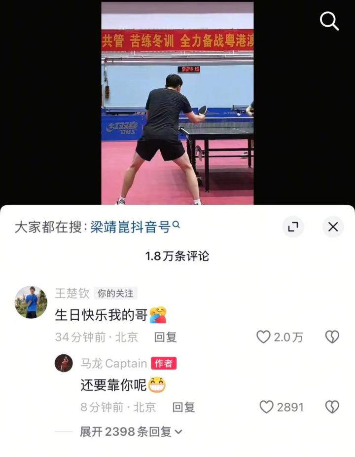马龙社媒回复王楚钦生日祝福:还要靠你呢gaoniu @懂球帝2025-10-20 21:3710月20日是奥运冠军马龙的37岁生日,他更新社媒表示正在努力训练、全力备战全运会。王楚钦评论:生日快乐我的哥。马龙则回复道:还要靠你呢!值得一提的是,今天也是国乒队员梁靖崑的生日,他蛋糕上写着四个字:逆转乾崑。展开更多