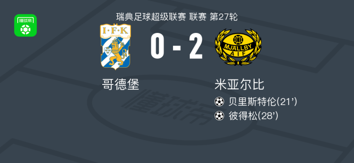 米亚尔比2-0哥德堡,贝里斯特伦建功,彼得松锁定胜局