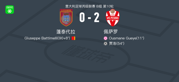 北京时间10月21日,意大利足球丙级联赛B组第10轮,蓬泰代拉主场迎战佩萨罗。比赛中,蓬泰代拉球员Ousmane Gueye不慎自摆乌龙,为对手取得领先。随后,佩萨罗球员贾洛攻入一球,进一步扩大比分优势。下半场补时阶段,蓬泰代拉球员Giuseppe Battimelli因累计两张黄牌被罚离场。最终全场比赛结束,蓬泰代拉0-2不敌佩萨罗。