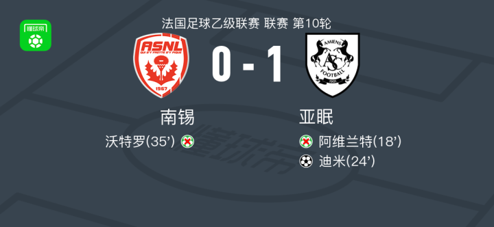 北京时间10月21日法国足球乙级联赛 联赛 第10轮,南锡主场对阵亚眠。亚眠迪米破门。最终比分南锡 0-1 亚眠。