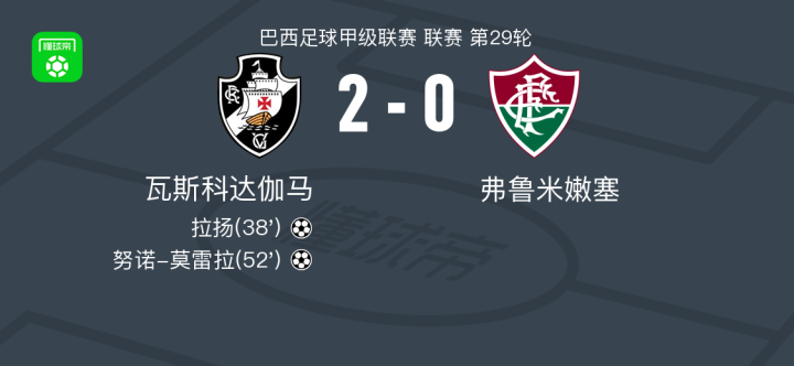 北京时间10月21日,巴西足球甲级联赛第29轮,瓦斯科达伽马坐镇主场迎战弗鲁米嫩塞。比赛中,保罗-恩里克送出精准助攻,帮助拉扬率先打破僵局。随后,努诺-莫雷拉再下一城,为球队扩大领先优势。凭借这两粒进球,瓦斯科达伽马将胜局保持至终场,最终以2比0战胜弗鲁米嫩塞。