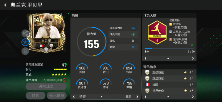 里贝里是一位对中国文化认同感十足的球星,“里贝里是朱元璋后代”也是足坛风靡一时的热梗。游戏中,里贝里的金球奖球员卡配备了边路超跑天赋,对他的加速、冲刺速度等数据提升显著,高级油炸丸子也确保了他的持球进攻能力。