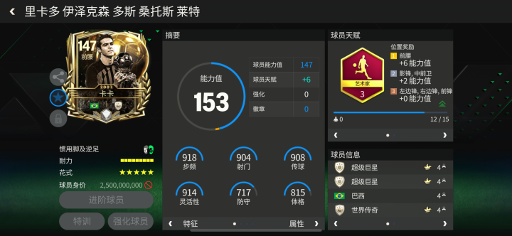 “银鞍照白马,飒沓如流星”,巅峰的卡卡曾力压梅西、C罗,捧得金球奖奖杯。金球奖活动中,卡卡的全新球员卡配备了艺术家天赋,对他的加速和远射都有提升。花式方面,高级油炸丸子搭配五星花式星级也是目前游戏中的顶级配置。