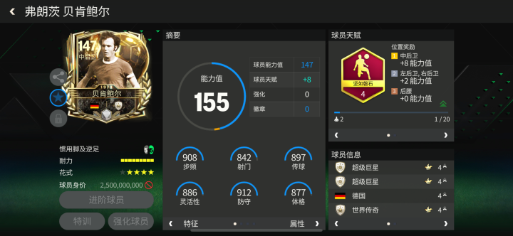 贝肯鲍尔绰号“足球皇帝”,是德国足坛璀璨的历史长河中,最伟大的传奇巨星之一。金球奖活动中,贝肯鲍尔推出的球员卡配备了坚如磐石天赋,这项天赋常见于后腰、中后卫等防守球员,对他的对抗强度和速度表现都有一定提升。