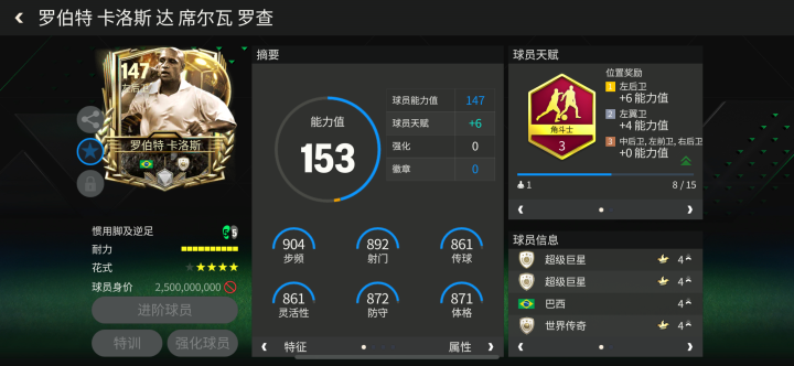 卡洛斯巅峰期是巴西男足和皇家马德里的双料核心边后卫,他那脚重炮远射也名震足坛。金球奖活动中,卡洛斯推出的球员卡配备了角斗士天赋,对他攻守两端多项数据都有提升,马赛回旋花式搭配10格耐力,卡洛斯尽显进攻型边后卫本色。