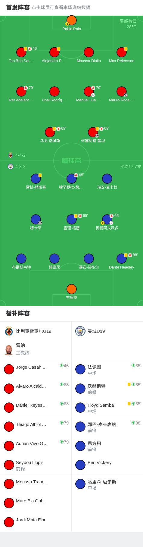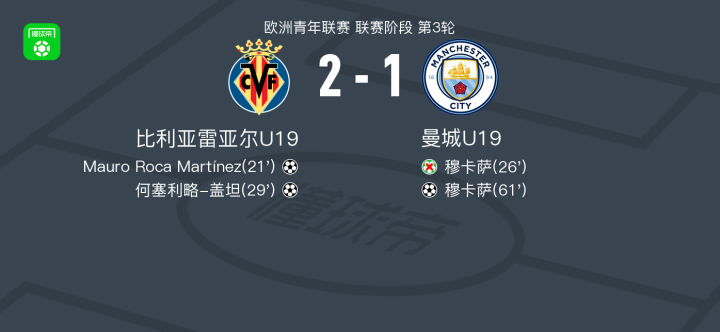 北京时间10月21日欧洲青年联赛 联赛阶段 第3轮,比利亚雷亚尔U19对阵曼城U19。比利亚雷亚尔U19Mauro Roca Martínez破门,何塞利略-盖坦破门。曼城U19穆卡萨破门。最终比分比利亚雷亚尔U19 2-1 曼城U19。