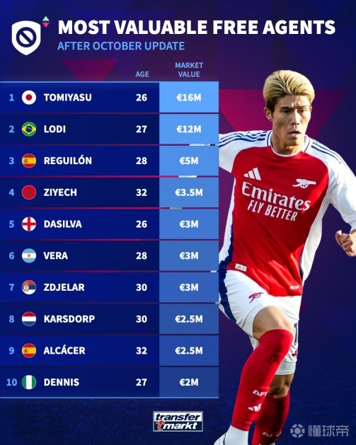今日德转对自由球员的身价进行了更新,在身价榜前十中,富安健洋以1600万欧居首,齐耶赫350万欧排第4。