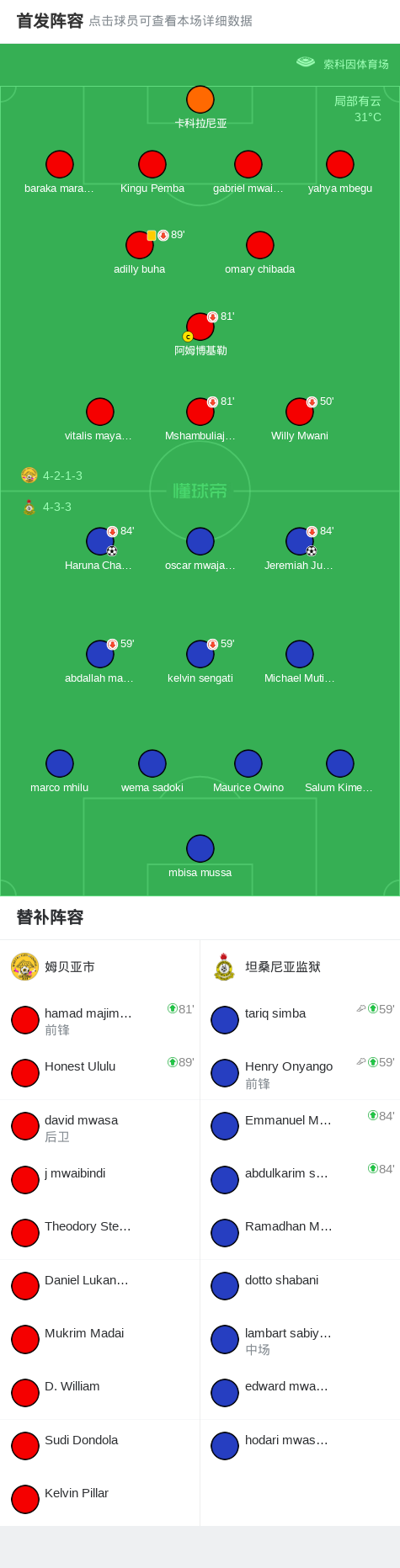 第71分钟,坦桑尼亚监狱球员tariq simba助攻Jeremiah Juma打入一球。