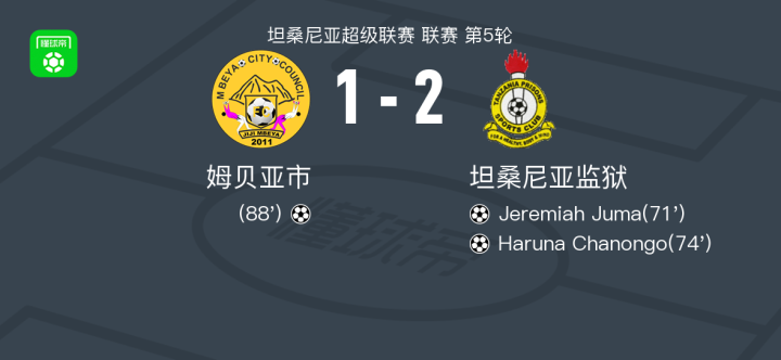 北京时间10月21日坦桑尼亚超级联赛 联赛 第5轮,姆贝亚市主场对阵坦桑尼亚监狱。坦桑尼亚监狱Jeremiah Juma破门,Haruna Chanongo破门。最终比分姆贝亚市 1-2 坦桑尼亚监狱。