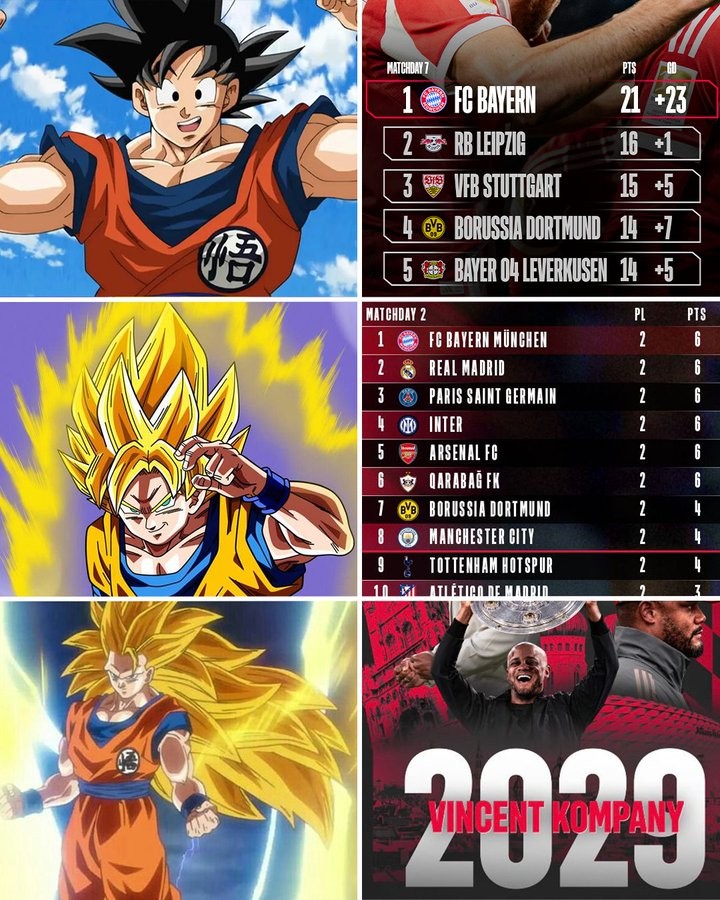 拜仁官方在社交媒体上晒出了一张海报,右边第一张图是德甲积分榜,目前拜仁位居榜首,而左边对应的是《七龙珠》里的悟空。右边第二张图是目前的欧冠积分榜,拜仁目前以6分位居积分榜榜首,而左边对应的则是超级赛亚人。