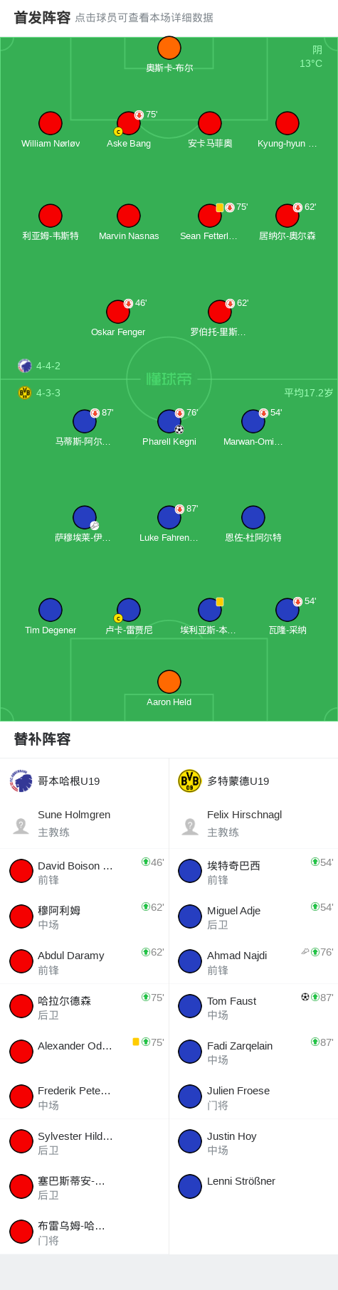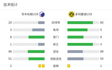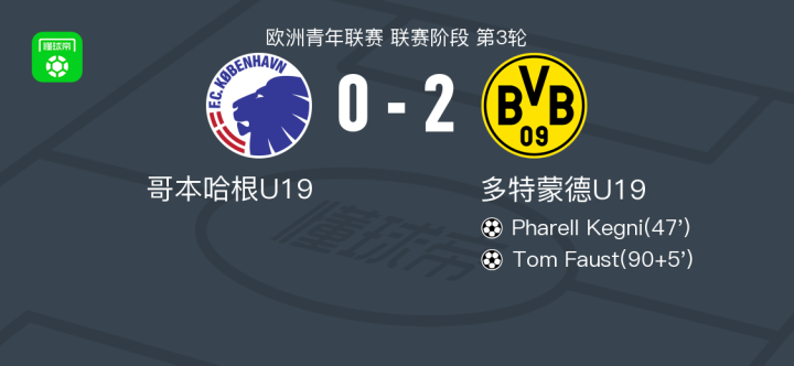 北京时间10月21日,欧洲青年联赛联赛阶段第3轮,哥本哈根U19迎战多特蒙德U19。比赛中,多特蒙德U19率先打破僵局,萨穆埃莱-伊纳西奥送出助攻,Pharell Kegni成功破门,为球队取得领先。随后在下半场补时阶段,Ahmad Najdi送出关键传球,Tom Faust冷静推射建功,帮助球队扩大比分。最终,多特蒙德U19以2比0战胜对手。