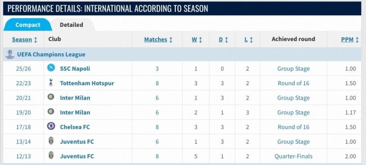 孔蒂欧冠带队战绩:45场16胜14平15负,胜率35.6%ZeroTsu_02 @懂球帝2025-10-22 10:02北京时间10月22日,欧冠精英联赛第三轮,那不勒斯客场对阵埃因霍温,最终那不勒斯在客场2-6不敌埃因霍温。据统计,这是孔蒂带队的第45场欧冠联赛,他共计取得16胜14平15负,胜率为35.6%,场均可以拿到1.38分。执教那不勒斯以来,孔蒂共计率队参加3场欧冠联赛,取得1胜2负的战绩。孔蒂曾在2012-2013赛季率领尤文图斯打进欧冠1/4决赛,最终两回合不敌拜仁被淘汰。展开更多