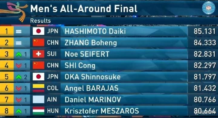 最后一个项目单杠,张博恒得到14.300分,最后得分84.333分,日本名将桥本大辉在单杠拿下14.700分,最终以85.131分获得冠军。