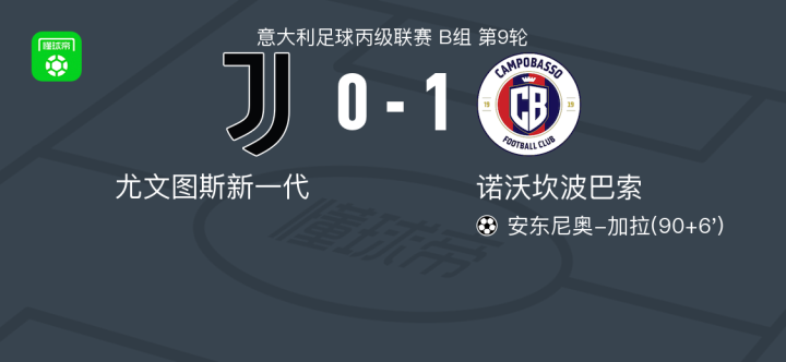 北京时间10月22日,意大利足球丙级联赛B组第9轮,尤文图斯新一代主场迎战诺沃坎波巴索。下半场补时阶段,诺沃坎波巴索球员安东尼奥-加拉攻入全场唯一进球。最终,尤文图斯新一代0-1不敌诺沃坎波巴索。