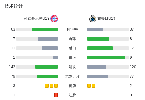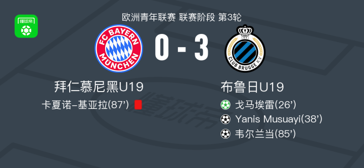北京时间10月22日,欧洲青年联赛联赛阶段第3轮,拜仁慕尼黑U19迎战布鲁日U19。比赛中,戈马埃雷主罚点球命中,为布鲁日U19取得领先。随后,Yanis Musuayi接应进攻打入一球,进一步扩大优势。比赛进入尾声阶段,韦尔兰当再入一球,帮助球队锁定胜局。临近结束,卡夏诺-基亚拉被红牌罚下。最终,布鲁日U19以3比0战胜对手。