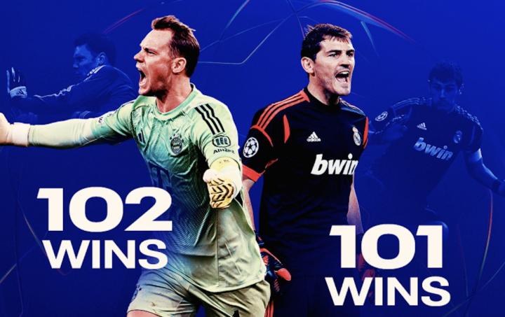 至此,这位39岁的德国门将在欧冠赛场已收获102场胜利,这使得他超越西班牙传奇门将卡西利亚斯,成为欧冠历史上胜场最多的门将。