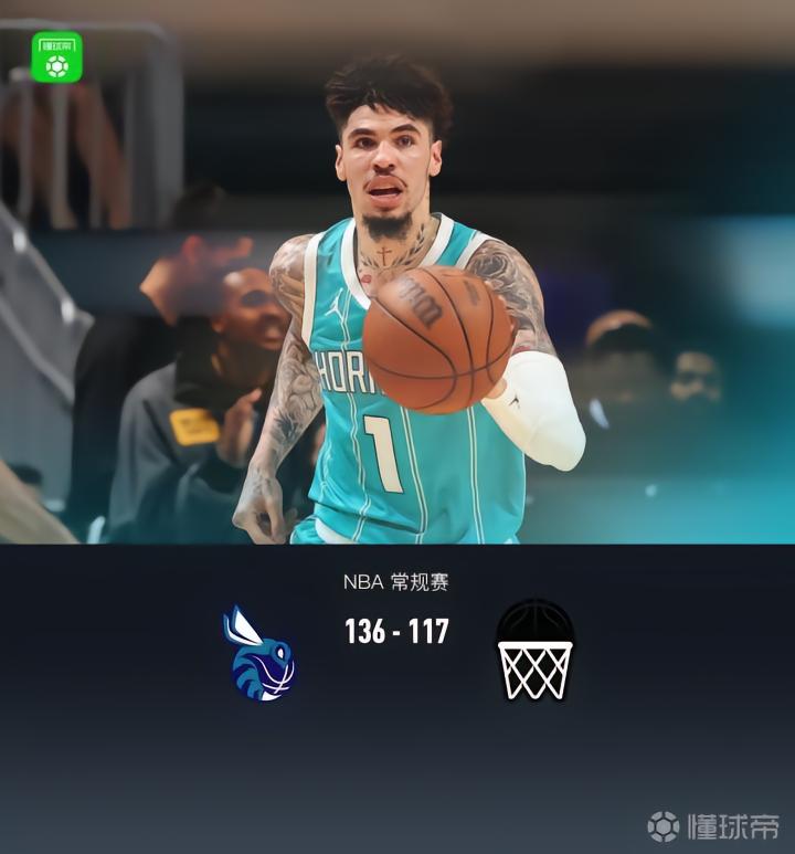 第四节黄蜂拉梅洛-鲍尔拿下7分,篮网曼恩拿下5分,最终黄蜂136-117战胜篮网