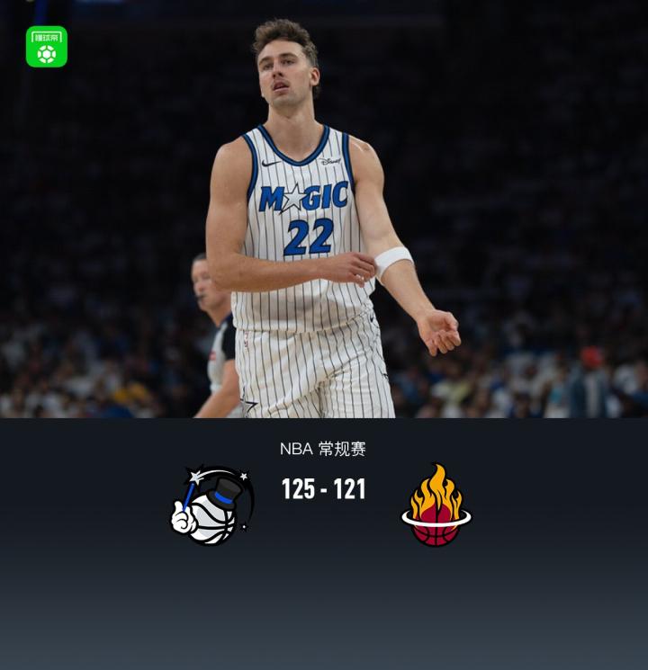 第四节魔术班凯罗拿下8分,热火诺曼-鲍威尔拿下8分,最终魔术125-121战胜热火