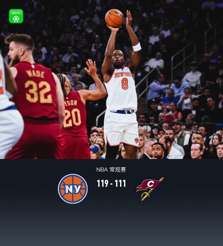 第四节尼克斯OG-阿奴诺比拿下9分,骑士梅里尔拿下8分,最终尼克斯119-111战胜骑士