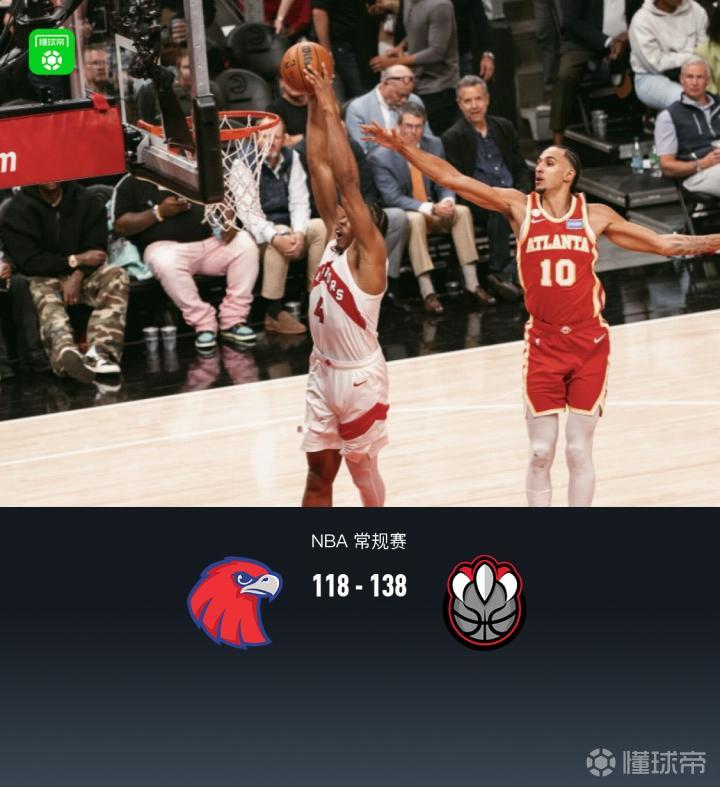 北京时间10月23日NBA 常规赛,亚特兰大老鹰对阵多伦多猛龙。半场老鹰59-65猛龙,最终老鹰118-138猛龙。