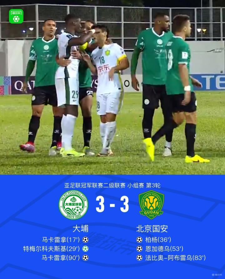 北京时间10月23日亚足联冠军联赛二级联赛小组赛第3轮,大埔对阵北京国安。大埔队马卡雷拿梅开二度,特梅尔科夫斯基破门。国安队柏杨、恩加德乌、法比奥-阿布雷乌分别破门。最终比分大埔3-3北京国安。