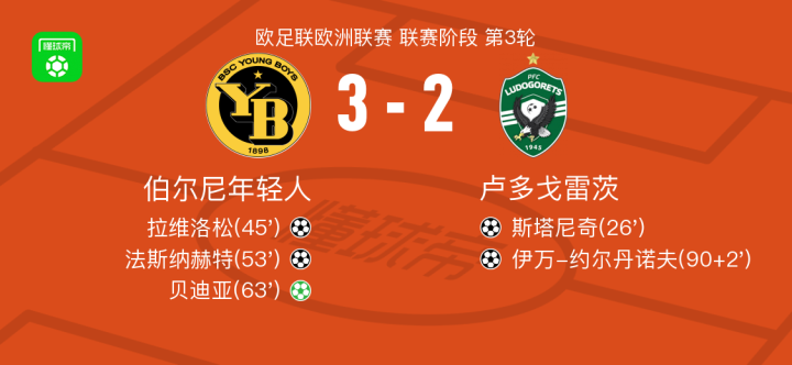 北京时间10月24日,欧足联欧洲联赛联赛阶段第3轮展开较量,伯尔尼年轻人与卢多戈雷茨展开激烈对决。比赛伊始,卢多戈雷茨率先打破僵局,特克佩泰送出助攻,斯塔尼奇完成破门,帮助球队取得领先。临近上半场结束,瑞安-安德鲁斯为伯尔尼年轻人建功,拉维洛松接其传球扳平比分。易边再战,埃迪米尔森-费尔南德斯送出精准传递,法斯纳赫特推射得手,伯尔尼年轻人实现反超。随后,贝迪亚主罚点球命中,进一步扩大领先优势。比赛进入尾声阶段,伊万-约尔丹诺夫为卢多戈雷茨打入一球,试图挽回局势。最终,伯尔尼年轻人以3比2战胜卢多戈雷茨。