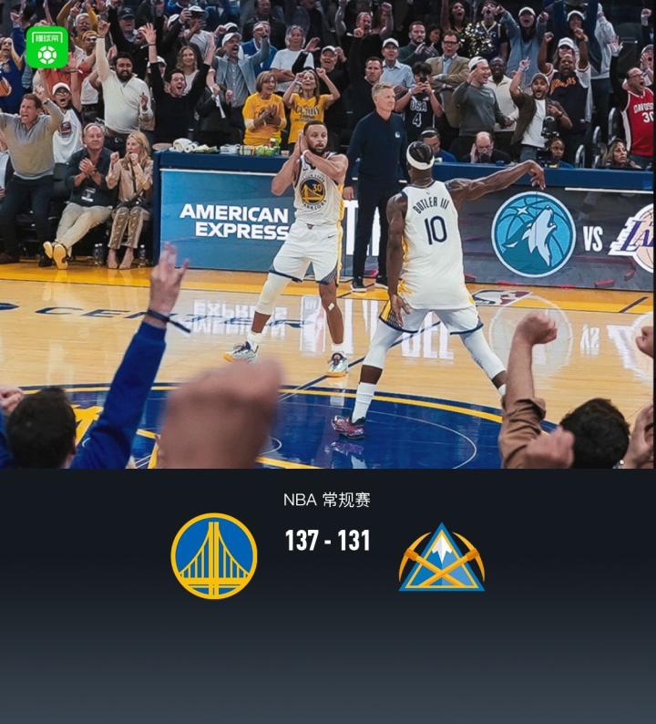 加时赛,勇士库里上来三分继续,掘金戈登2+1回应,随后短暂拉锯之后,掘金约基奇、穆雷持续进攻不中,勇士格林内线得分,紧跟巴特勒压哨三分,库里反击得分领先8分,彻底杀死比赛,最后阶段掘金挣扎无果,全场结束,勇士137-131掘金。