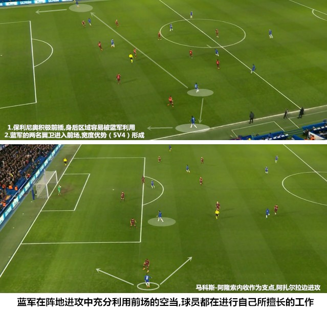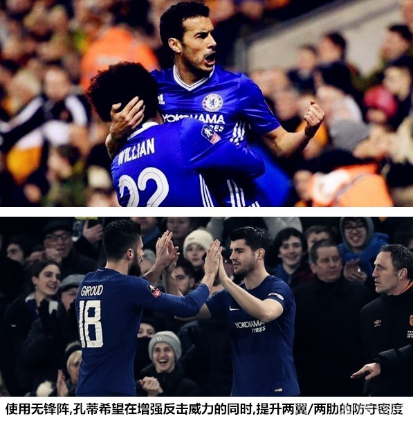 孔蒂的343阵型之所以能够在盛行四后卫的英超赛场取得成功,很大程度上得益于两翼卫纵向运动在两个禁区附近制造出的多出一人的优势,原本难以在豪门成为主力的马科斯-阿隆索和摩西成为不对称优势格局下的最大受益人之一。从2016/17赛季后期开始,越来越多的英超球队采取三后卫镜像兑子的方式去限制蓝军两翼的展开,同样来自伦敦的热刺和阿森纳都从中获利颇丰。