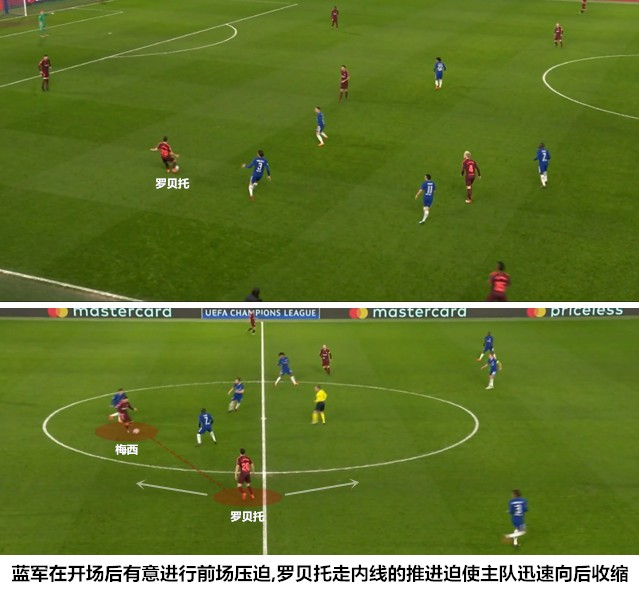 巴塞罗那和切尔西是列强中不太适合执行高位紧逼战术的两家,孔蒂使用三中卫阵型的初衷都是为了提升后场的防守密度并解放前场攻击手,威廉、佩德罗和吕迪格的出场能够让阵型更加紧凑,但由于中前卫组合运动能力差距较大且防守防线核心克里斯滕森更加适合低位防守,执意驱动高压反抢很可能因为单点的陷落而造成体系坍塌。切尔西在开场后曾有意尝试前场紧逼,由于双后腰很难在三前锋身后形成很好的覆盖和跟进,在罗贝托利用一次突然启动进入中圈弧与梅西取得联系后(3’),蓝军迅速退入后场执行深度防反战术。罗贝托的中场化打法在有些时候会造成中路的拥堵,但他却是重要的纵深空间创造者,罗贝托的持球推进能够化解对手高位紧逼,这种素质在阵型窄化且部分中场球员运动能力不足的情况下显得尤为重要。