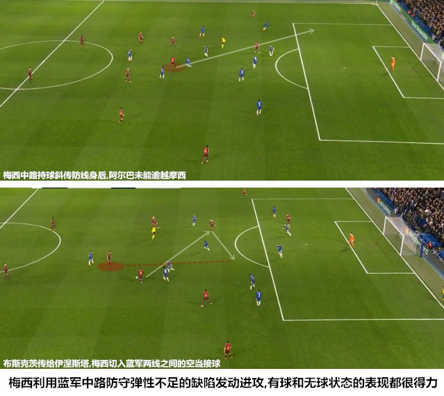 在成功地取得球权之后,巴塞罗那利用蓝军5-4-1防守站位在中场中路的空当,依靠布斯克茨-梅西的联系持续不断地将战火燃烧在蓝军半场。切尔西541阵型的优势在于可以很好地封锁巴萨的肋部进攻,坎特和法布雷加斯会努力守住内线将梅西引向边肋部的“口袋”中,再通过边中卫的上抢和中卫、边翼卫的夹击保护形成难以逾越的多重拦阻索,在防区外围只留一名边翼卫吸引巴萨的边后卫助攻。蓝军可以凭借禁区内的人数优势完成解围,进而利用巴萨边卫助攻上前后留下的空当,也正是发现了边肋部渗透的艰难、边路一对一成功率不高(阿尔巴VS摩西)以及边路传中效率低下登一系列问题,巴尔韦德在上半场适时地减少了两名边后卫的助攻,梅西-保利尼奥在中路的连线成为了球队在进攻终端的主要威胁。