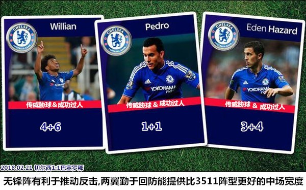 比赛进行到第30分钟左右,切尔西依靠一波敦促突击制造了几次不错的快攻机会,威廉先是在反击中利用突破制造了拉基蒂奇的黄牌,后又在几分钟内两次外围远射中柱,阿扎尔在这一阶段也完成了一次颇具威胁的禁区内射门,巴塞罗那的外围防区一度沦陷。孔蒂的球队在这一阶段能够形成连续进攻有以下三点原因:一是三名前锋突然加强了前场逼抢,佩德罗和威廉利用脚下频率快的特点很好地限制了皮克和乌姆蒂蒂的出球;二是坎特积极上抢干扰布斯克茨的出球,吕迪格和阿兹皮利奎塔在上抢填补后腰区域时的表现免除了法国人的后顾之忧;三是阿扎尔带动多人在左肋部实施的佯攻很好地牵制了巴萨的防守重心,当巴萨中场的两大单防强点保利尼奥和拉基蒂奇皆被“钉”在一侧后,由弱侧移镇中路的威廉自然能够获得比较宽松的射门空间。