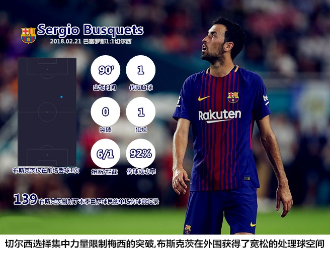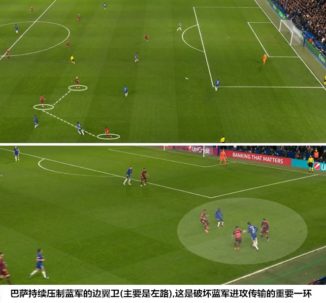 巴塞罗那不会使用三中卫阵型,但巴尔韦德在重要比赛中会限制两名边后卫的助攻以避免被对手打身后,保利尼奥的戍边在罗贝托身前形成一道屏障。考虑到前场缺乏高点,马科斯-阿隆索在边线处遭遇夹击时首先会考虑横传联系弱侧的队友,而不是大脚开向前场,三名中后卫在拉边接球后同样如此,这为蓝军在下半场的失误丢球埋下了伏笔。