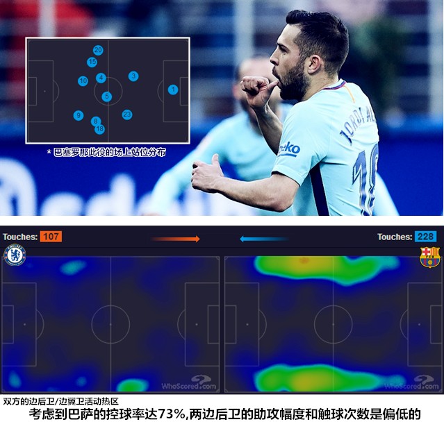 从表面上来看,拥有70%控球率的红蓝军团在客场并不保守。然而,从边后卫在上半场助攻幅度不大,由拉基蒂奇担当中前卫而让保利尼奥司职右翼,控球的首要目的不是急于取得进球而是压制对手的进攻(尤其是两翼),前场反抢幅度不大但针对性很强,丢球后最大限度地保证回防到位率等细节处理上可知,巴尔韦德的客战思路依然是追求攻守平衡。当然,保证平衡的代价自然是进攻投入度有所降低,这就是巴塞罗那长期掌控球权却未能创造出足够多绝对机会的原因。