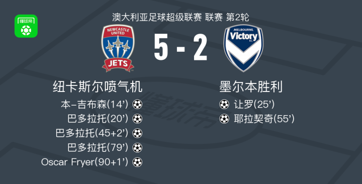 纽卡斯尔喷气机5-2大胜墨尔本胜利,巴多拉托帽子戏法,Oscar Fryer破门
