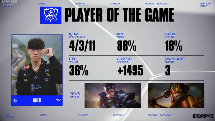 第22分钟,Doran加里奥闪现撞墙,Quid阿卡丽二段E翻山越岭跟上Doran,随即将Oner皇子也击杀;