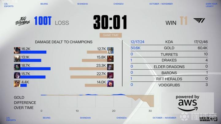 北京时间10月24日,英雄联盟S15全球总决赛1-2组第二场,LCK赛区4号种子T1对阵LTA赛区3号种子100T。本局Quid阿卡丽发挥完美,但100T其余人没能回应,T1 2-0战胜100T进入2-2池子。