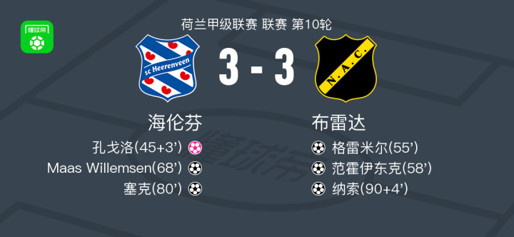 下半场补时第4分钟,布雷达球员布兰助攻纳索打入一球。
