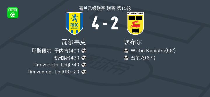 瓦尔韦克4-2坎布尔,Tim van der Leij梅开二度,凯珀斯破门