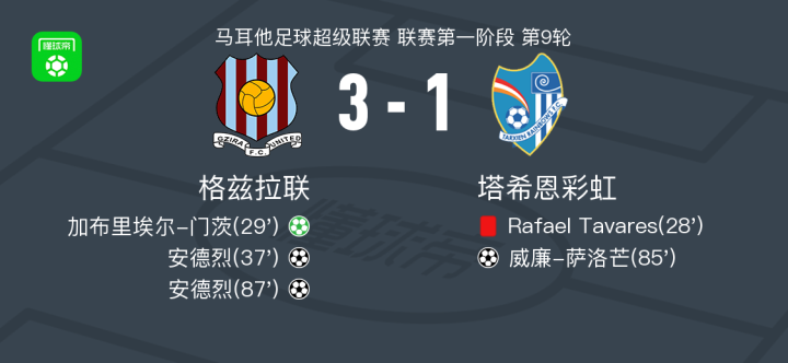 北京时间10月25日马耳他足球超级联赛 联赛第一阶段 第9轮,格兹拉联主场对阵塔希恩彩虹。格兹拉联加布里埃尔-门茨破门,安德烈梅开二度。塔希恩彩虹威廉-萨洛芒破门。最终比分格兹拉联 3-1 塔希恩彩虹。